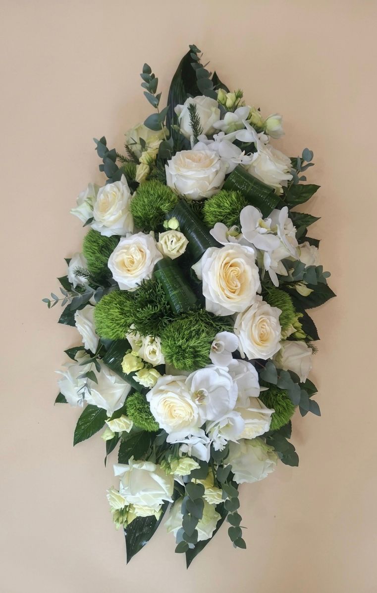 Wyjątkowa kompozycja o szlachetnym, kaskadowym kształcie, utrzymana w łagodnej, jasnej kolorystyce. Spójne połączenie delikatnej zieleni i kremowych bieli tworzy atmosferę głębokiego spokoju i klasy. To subtelny symbol cichego pożegnania, elegancji oraz wiecznego, nieskazitelnego wspomnienia.
