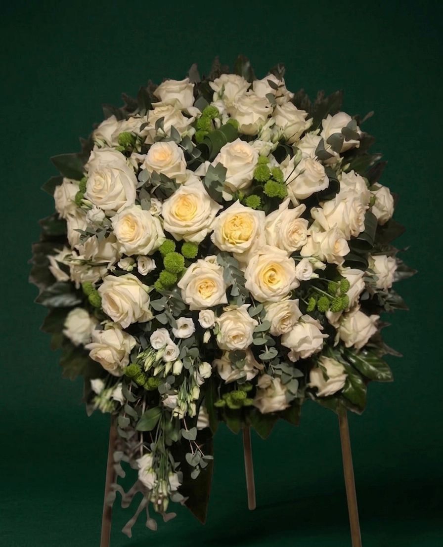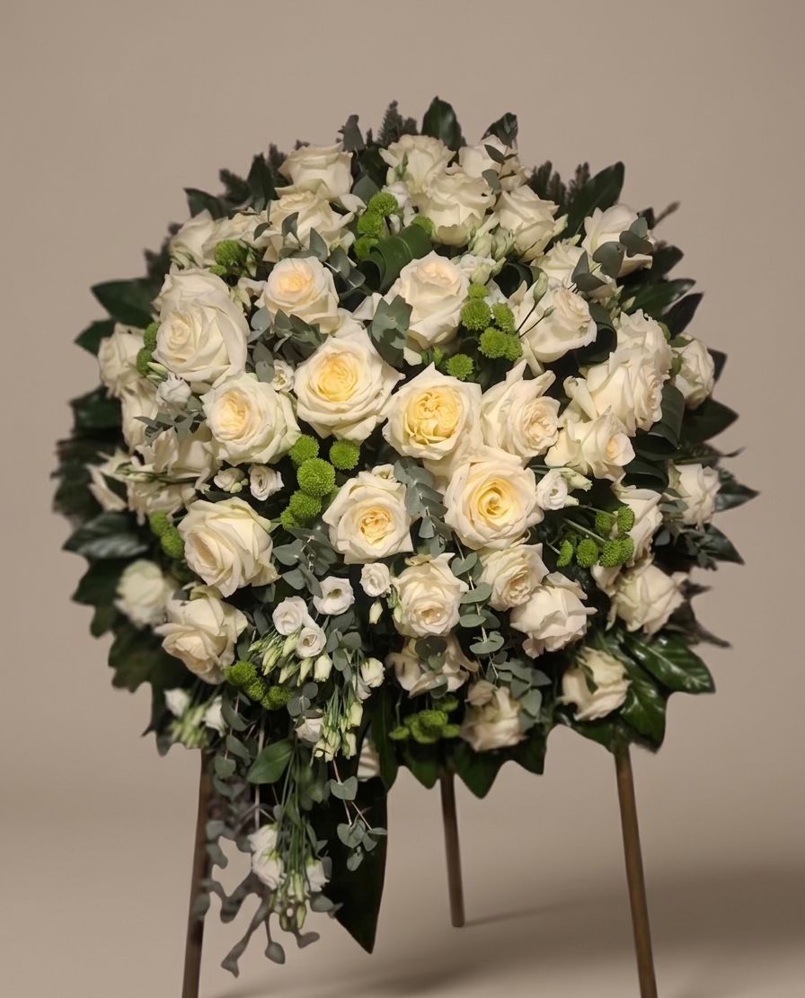 Klasyczny i pełen dostojeństwa wieniec skomponowany z eleganckich, jasnych róż oraz delikatnych zielonych akcentów. Czystość bieli w połączeniu z głęboką zielenią tworzy kompozycję o ponadczasowym charakterze, będącą symbolem niewinności, czci i wiecznej pamięci.