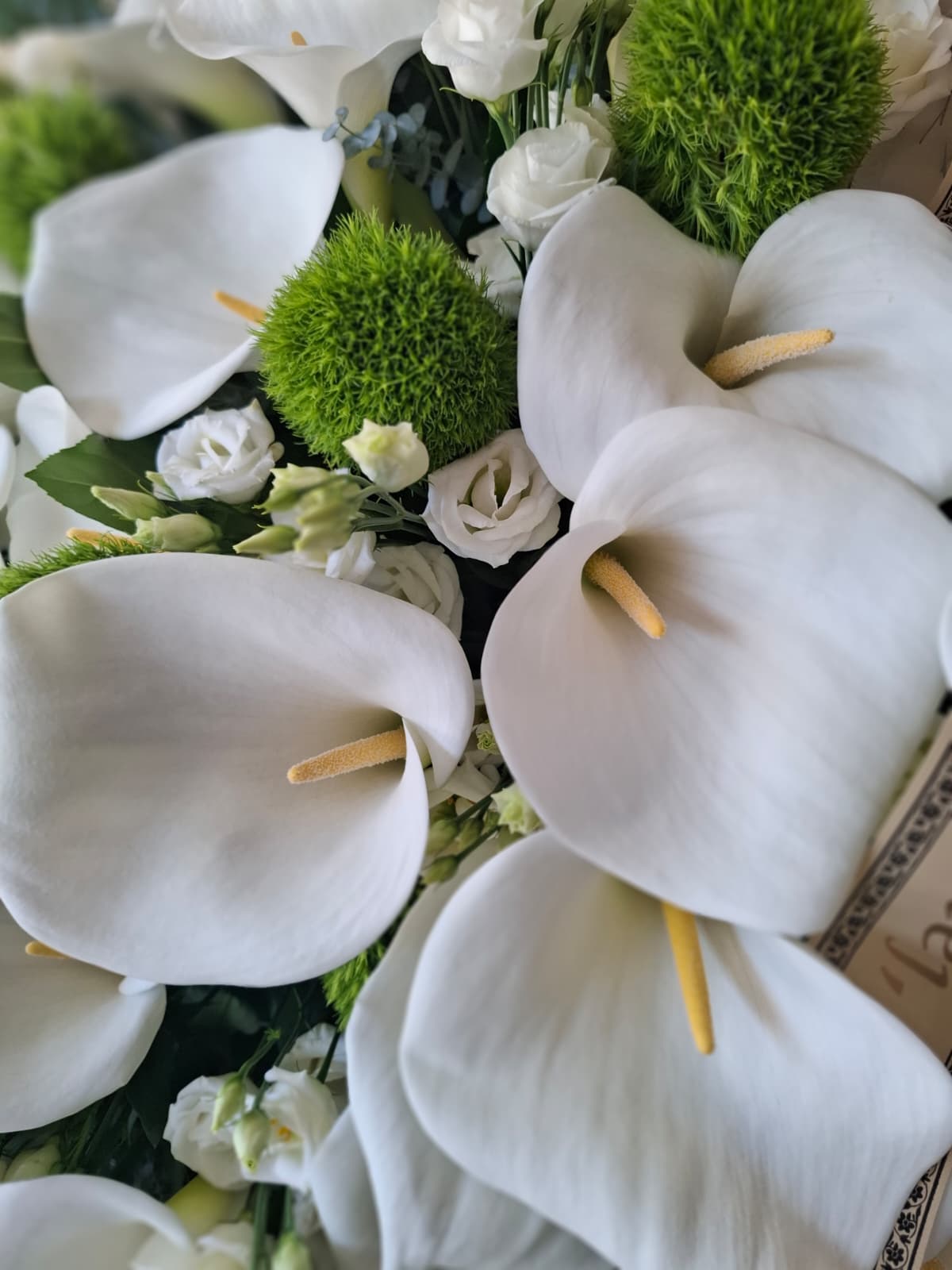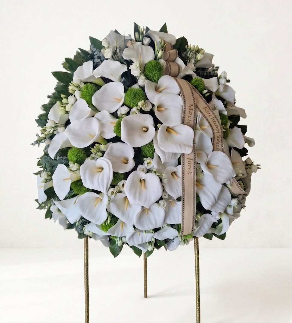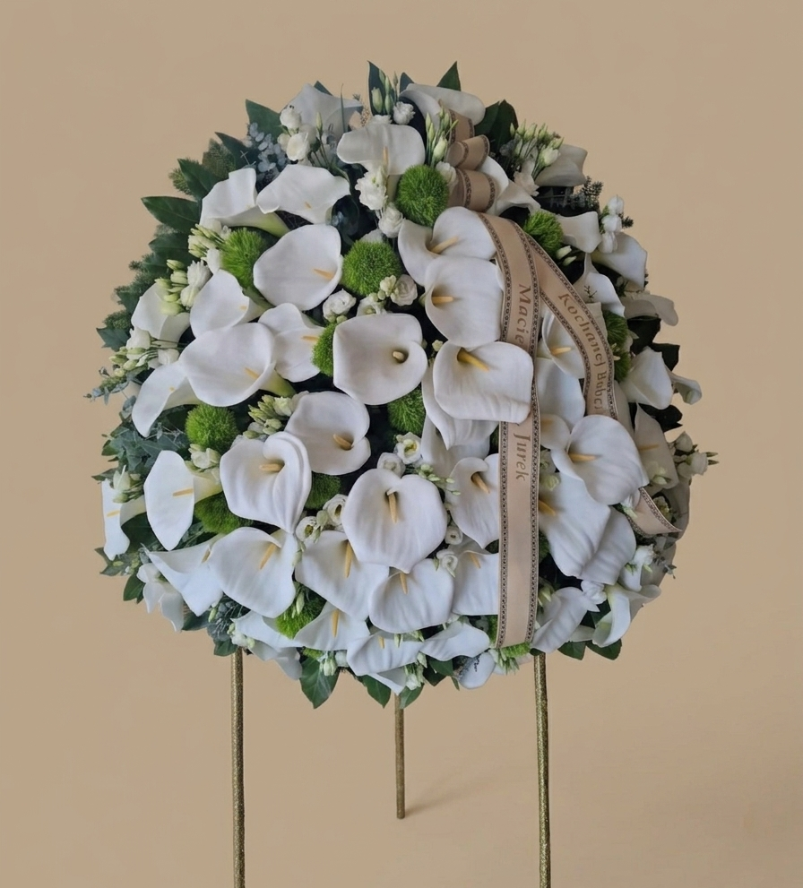Ten wyjątkowy wieniec to uosobienie delikatności i dostojeństwa, zachwycające imponującą liczbą śnieżnobiałych kalii. Harmonijne połączenie klasycznej bieli z subtelną eustomą oraz zielonymi goździkami tworzy niezwykle szlachetną całość, która w godny sposób oddaje hołd bliskiej osobie. Kompozycja jest dostępna w trzech wariantach, aby jak najlepiej dopasować się do Państwa potrzeb: Standard (40 kalii), Deluxe (50 kalii) oraz Premium (60 kalii), z których każdy wzbogacony jest o świeże dodatki kwiatowe.