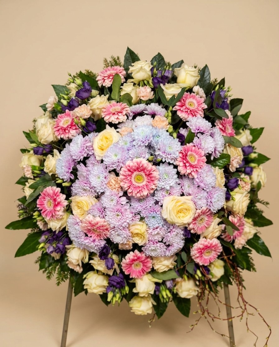 Wyjątkowa kompozycja w formie klasycznego koła, wykonana z kwiatów w łagodnych, pastelowych odcieniach. Harmonijne połączenie delikatnego różu, bieli i subtelnych fioletów tworzy oprawę pełną spokoju i klasy, będącą wyrazem najgłębszego szacunku oraz pamięci o bliskiej osobie.